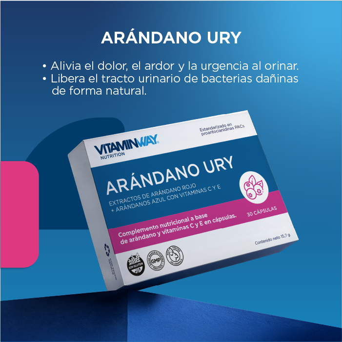 Arándano Ury Vitamin Way® ayuda a cuidar tu sistema urinario de forma natural. Sus arándanos, especialmente el arándano rojo, contribuyen a impedir que las bacterias se adhieran, apoyando el bienestar urinario todos los días.