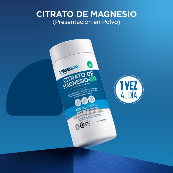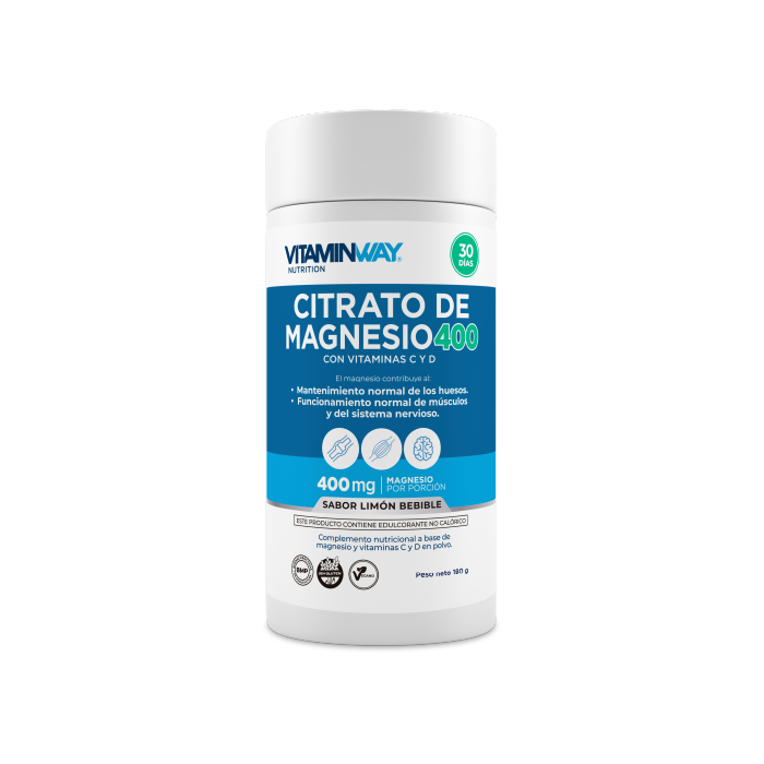 Citrato de Magnesio Vitamin Way® Aporta 400 mg de magnesio elemental por porción de alta absorción. Con vitaminas C y D, ayuda a relajar los músculos, fortalecer los huesos, mejorar la digestión y apoyar el equilibrio del sistema nervioso.