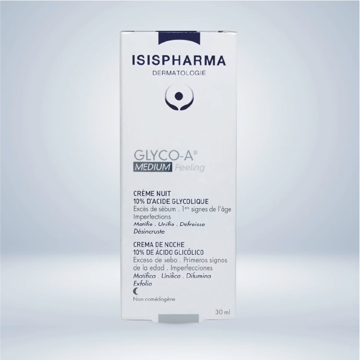 Es una crema de noche tipo peeling químico de uso domiciliario que contiene 12% de ácido glicólico (AHA). Está diseñado para renovar la piel, mejorar su textura y aportar luminosidad, actuando durante la noche sin necesidad de enjuague. Su fórmula con pH 3 logra un equilibrio entre eficacia exfoliante y tolerancia cutánea, ayudando a tratar imperfecciones, exceso de grasa y primeros signos de la edad.
