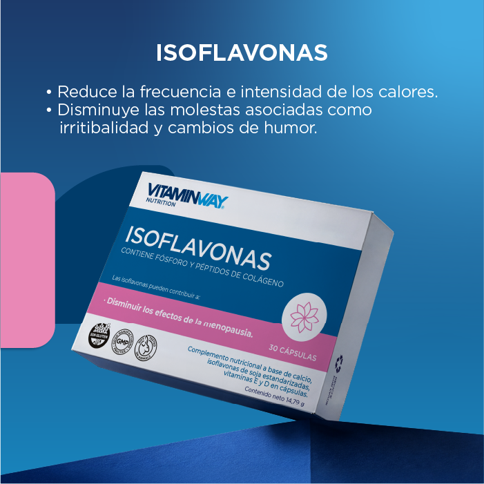 Isoflavonas Vitamin Way® apoya el bienestar femenino durante la menopausia. Ayuda a controlar los calores y, gracias a su fórmula con calcio, fósforo y vitamina D, contribuye a mantener huesos y articulaciones fuertes.