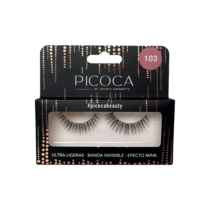 Las pestañas PICOCA son ultra ligeras, efecto mink. Gracias a la ligereza de su pelo y a su banda invisible, son lo más parecidas al pelo natural. ¡No pesan, no se sienten, no incomodan! El modelo 103 es ideal para ojos medianos o grandes. Si buscas un modelo súper natural pero con intensidad. Beneficios: